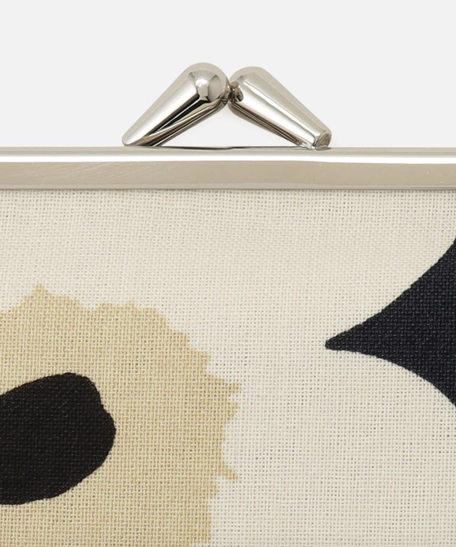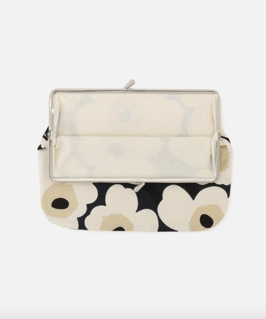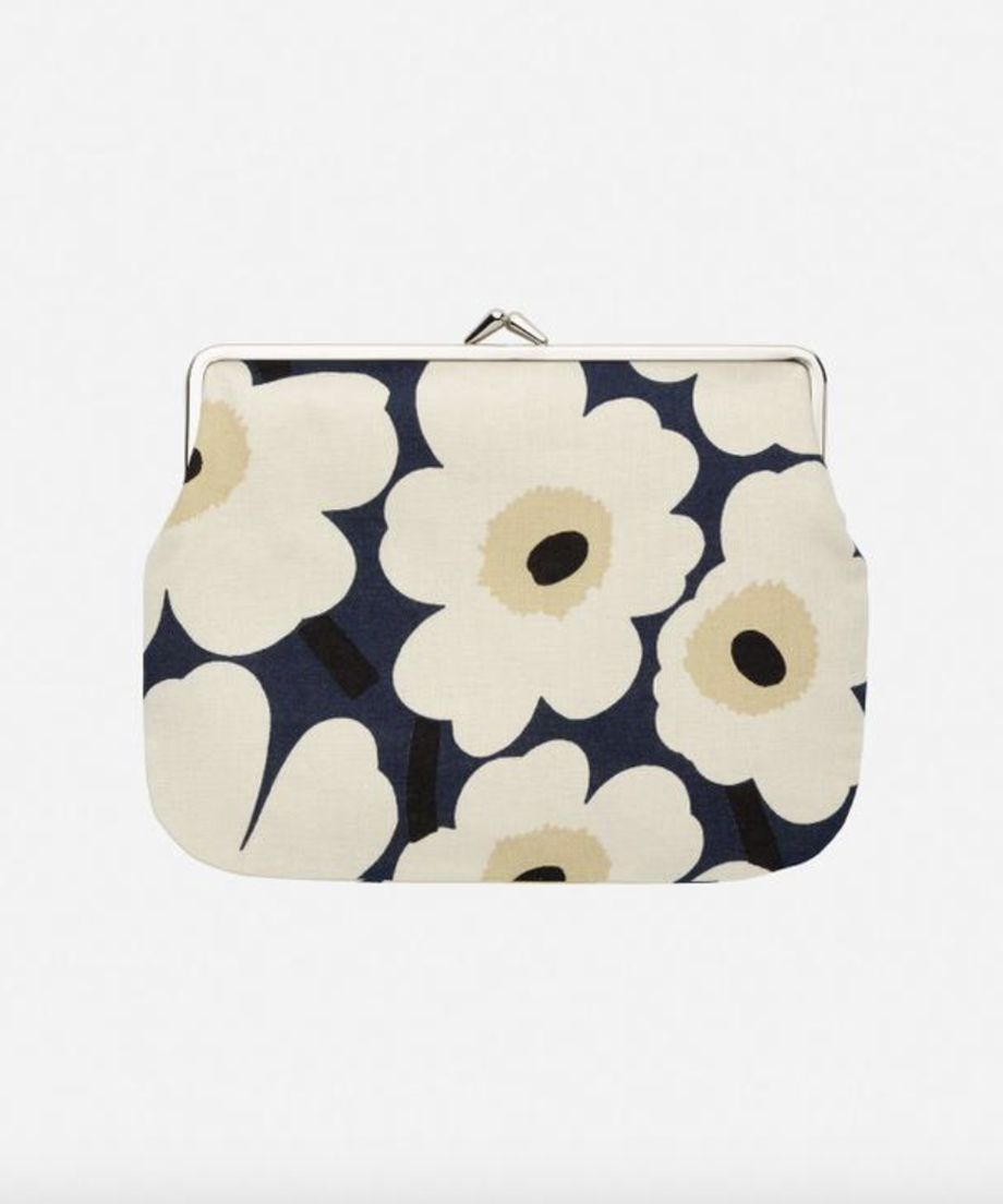 ケシの花をモチーフにした「ウニッコ」パターンを、メタリックゴールド×ネイビーブルーで仕上げた日本限定コレクションのがま口ポーチ。コスメや文房具、通帳などをすっきり収納でき、大きく開く口金で中身も見やすく取り出しやすい仕様。自分用にも、ギフトにもおすすめの一品です。