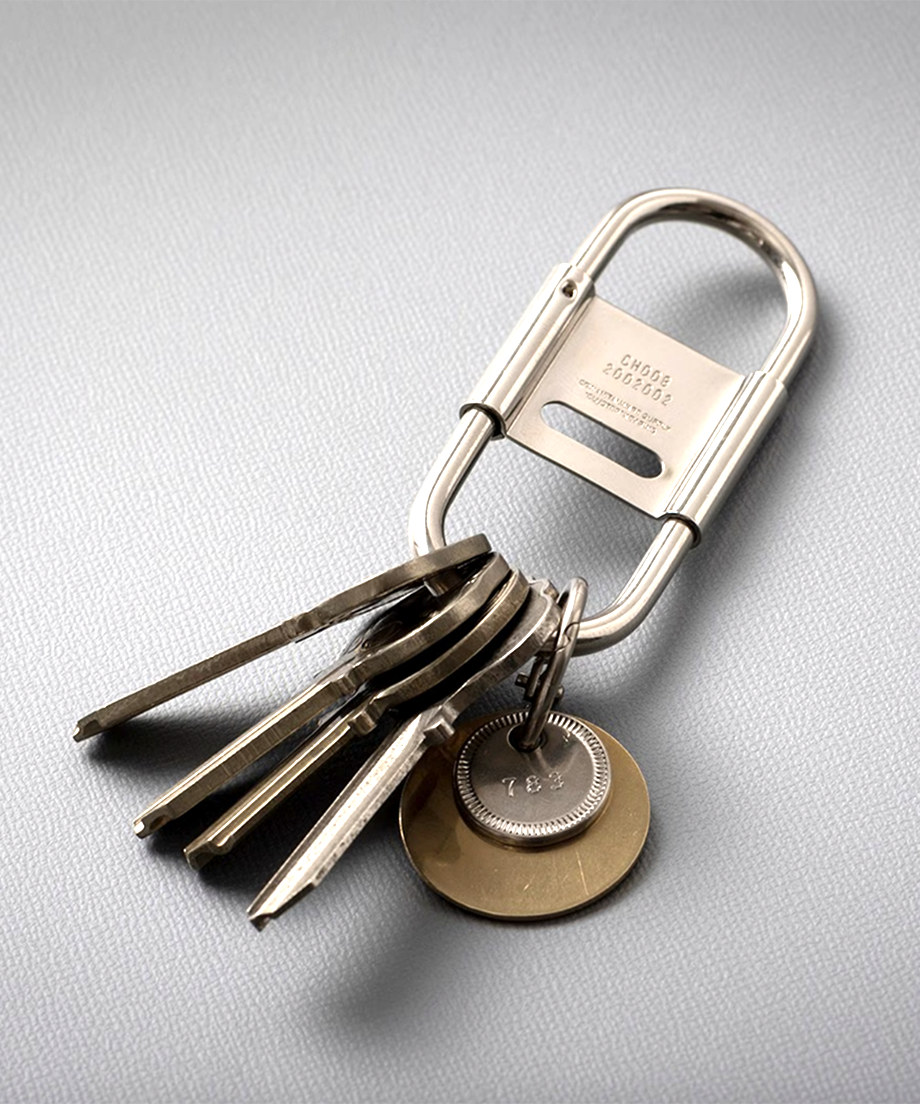 スプリング式で脱着しやすいカラビナタイプのキーホルダー。開閉式のセンターパーツがストッパーになり、ベルトループなどに付けた際キーリングと鍵の回転を防ぎます。使い込むほどに経年変化を楽しめるアイテムです。