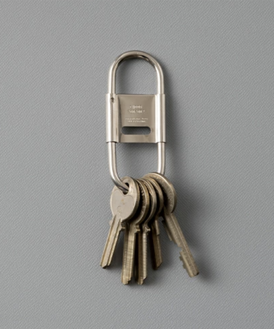 スプリング式で脱着しやすいカラビナタイプのキーホルダー。開閉式のセンターパーツがストッパーになり、ベルトループなどに付けた際キーリングと鍵の回転を防ぎます。使い込むほどに経年変化を楽しめるアイテムです。