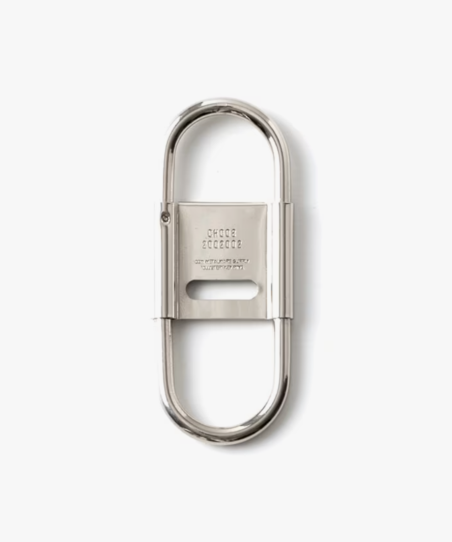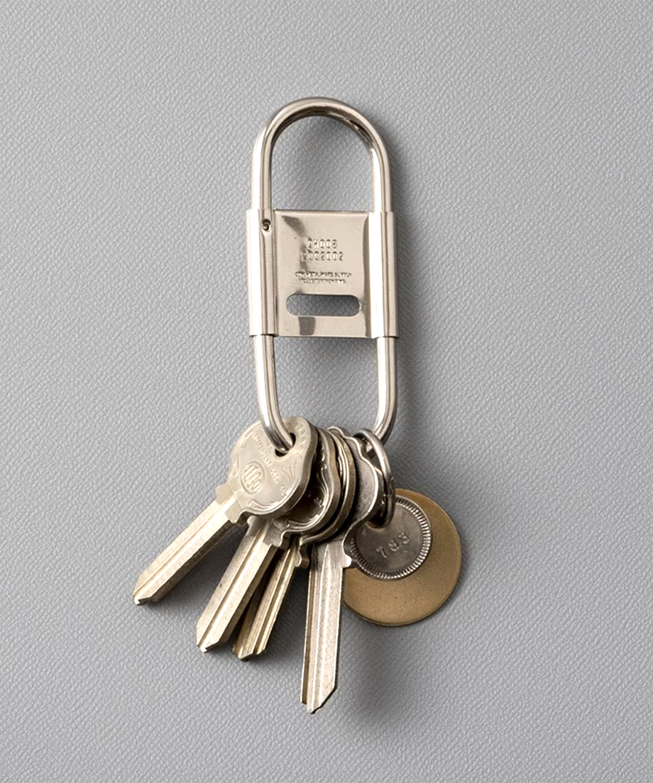 スプリング式で脱着しやすいカラビナタイプのキーホルダー。開閉式のセンターパーツがストッパーになり、ベルトループなどに付けた際キーリングと鍵の回転を防ぎます。使い込むほどに経年変化を楽しめるアイテムです。