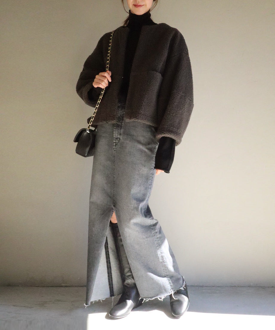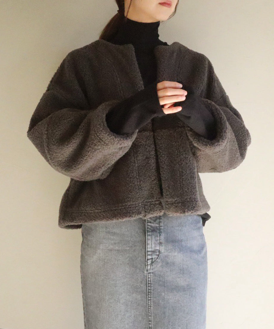 シープボアパイル素材を使用した、ふんわりあたたかなショートジャケット。やさしい肌触りとゆったりとしたシルエット、丸みのある肩のラインがリラックス感を演出します。ノーカラーのすっきりとした首元で、タートルネックとの相性も抜群。