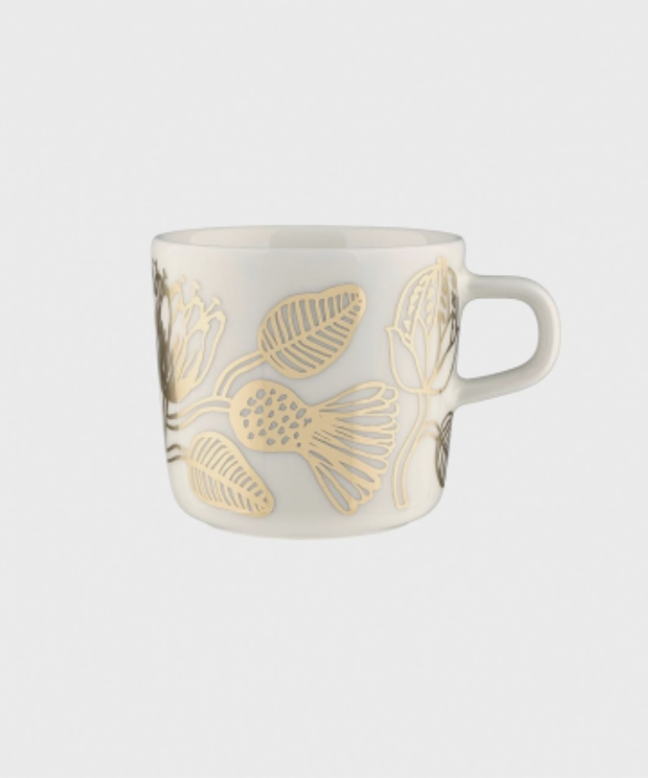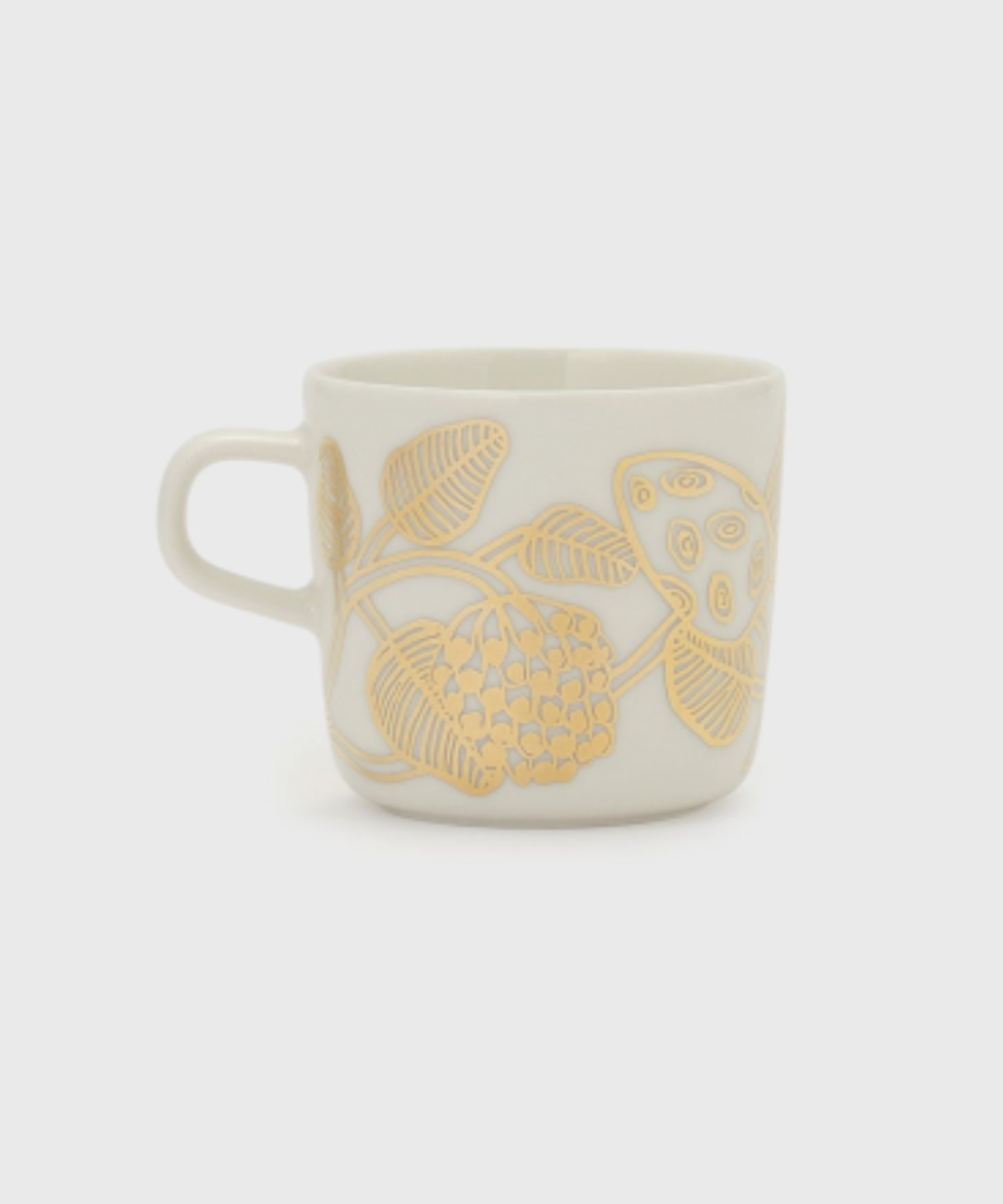 様々な植物や花々がぐるりと描かれたTiara柄が印象的な、200mlのコーヒーカップ。美しいゴールドメタリックの顔料による華やかでエレガントなカラーが、テーブルに上質なアクセントを添えます。少し高めの位置に付いた小ぶりの持ち手が、漂うモダンな雰囲気と使いやすさを両立。