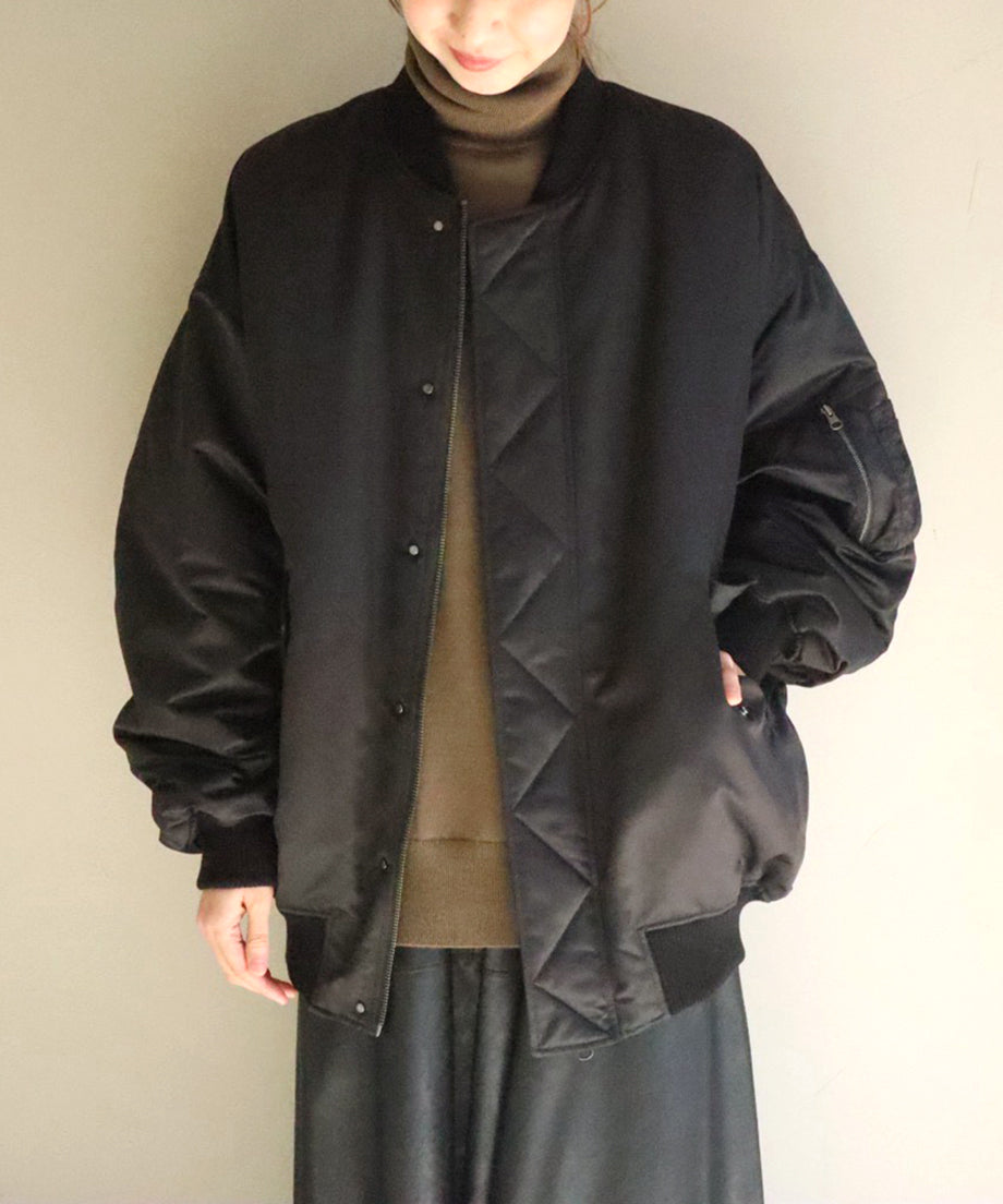 高密度に織り上げられたツイル素材を使用したフライトジャケット。程よい厚みとしなやかさを備え、美しい光沢感が魅力。メンズライクなオーバーシルエットで仕立てることで、モードな雰囲気と上品なカジュアル感を両立。シームパッカリングによるヴィンテージライクな表情や、衿・袖口・裾に配した上質なウール混リブなど、細部までこだわり抜いた一着。