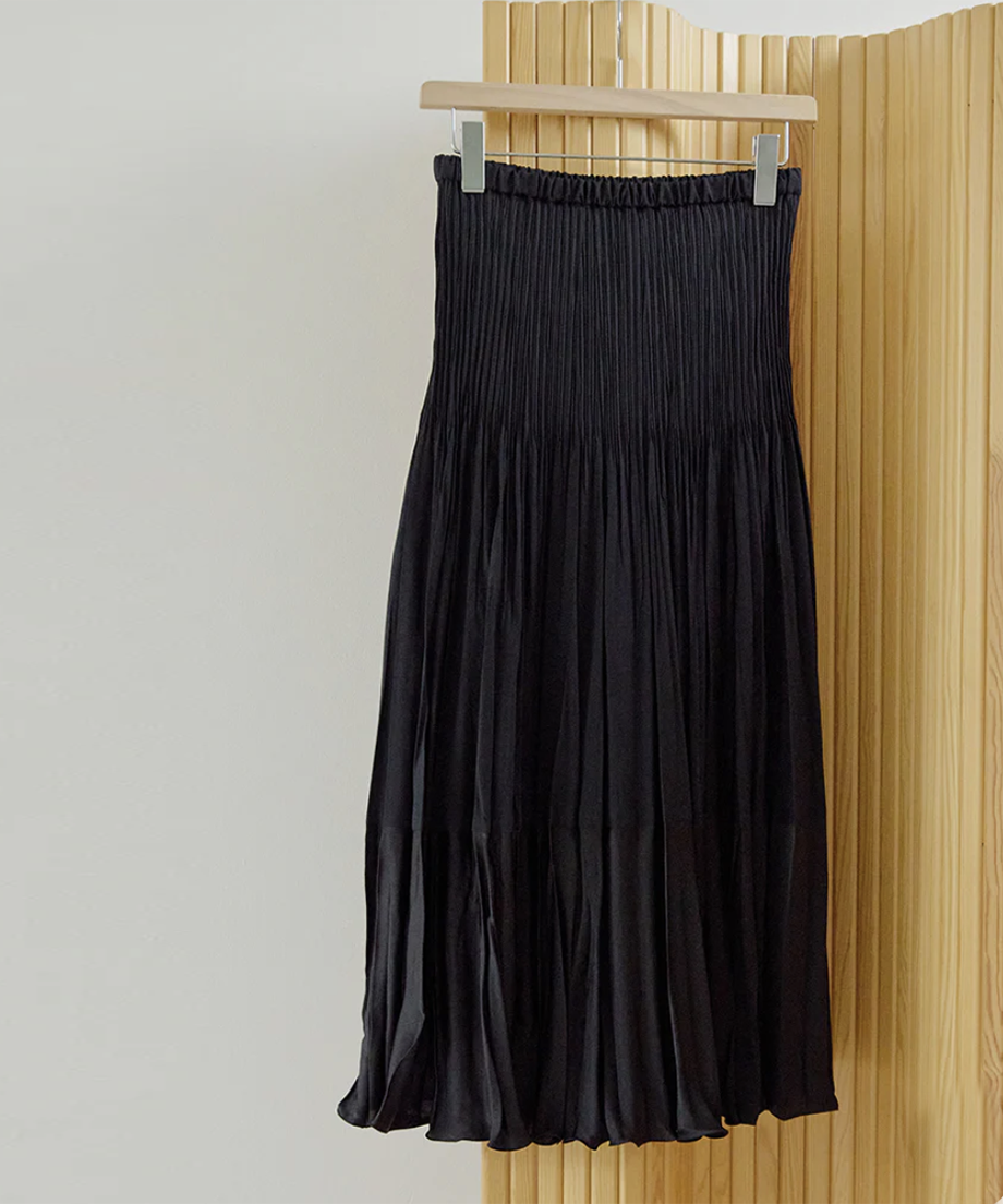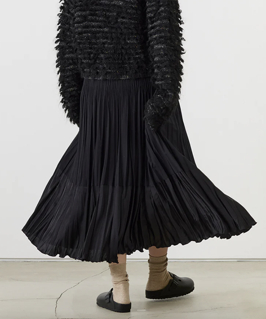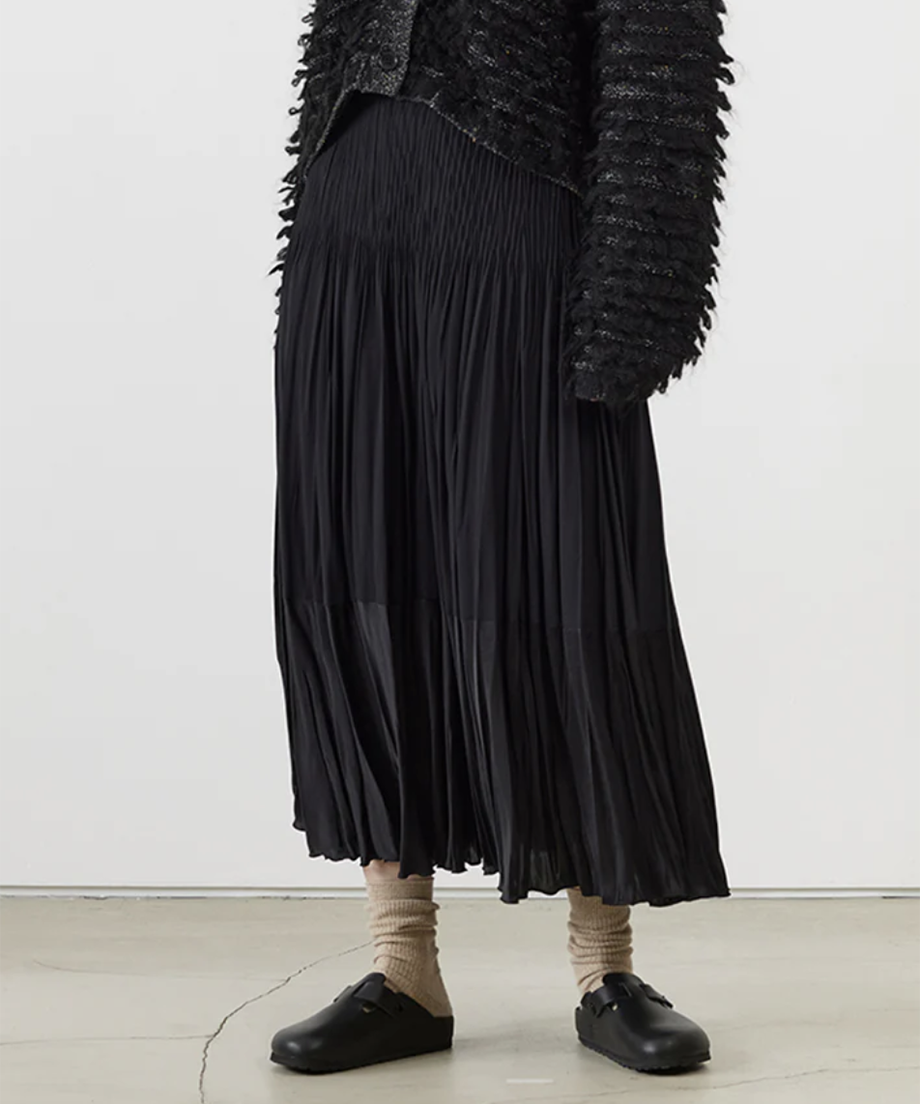 異素材を組み合わせた奥行きのあるプリーツスカート。光沢の異なる生地が生み出す立体感と陰影が美しく、動くたびに上品な揺れを演出します。細かなプリーツからランダムな広幅プリーツへの切り替えで、広がりすぎないすっきりとしたシルエットに。