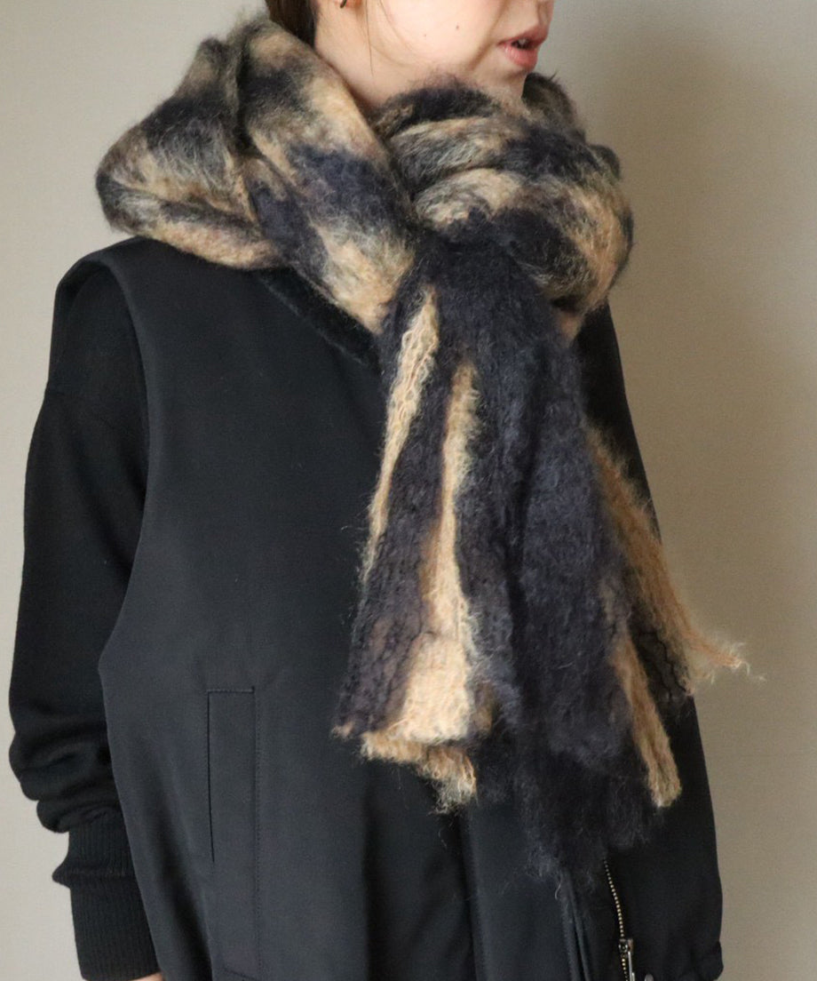 柔らかな色合いとチェック柄が特徴の大判マフラー。編み模様の上にモヘアを重ねた構造が、立体感のある仕上がりを演出します。フリンジ付きのデザインで、首元に巻くと程よいボリューム感が生まれます。毛とナイロンをブレンドした軽やかで暖かな素材は、肌触りが良く快適な着け心地。寒い季節を華やかに彩る必須アイテムです。