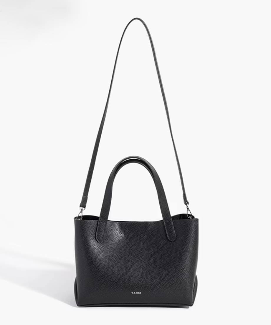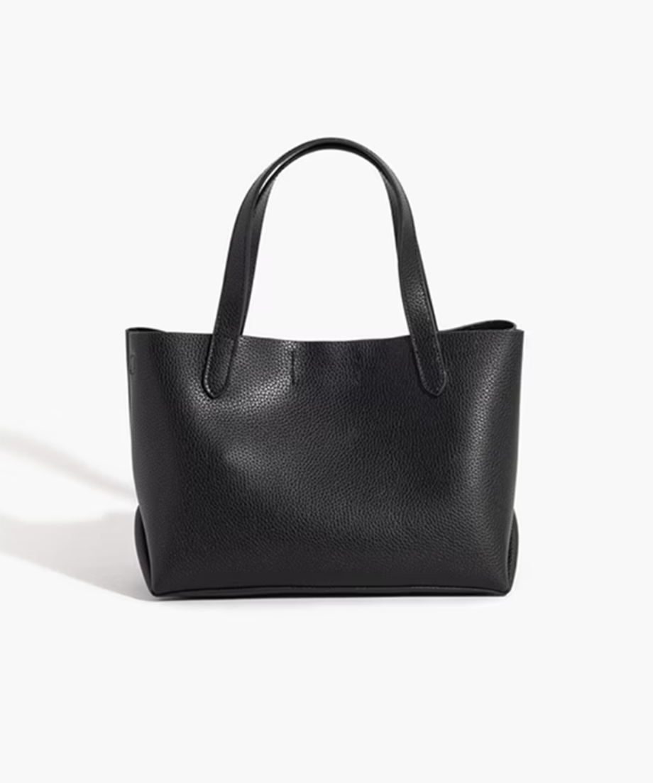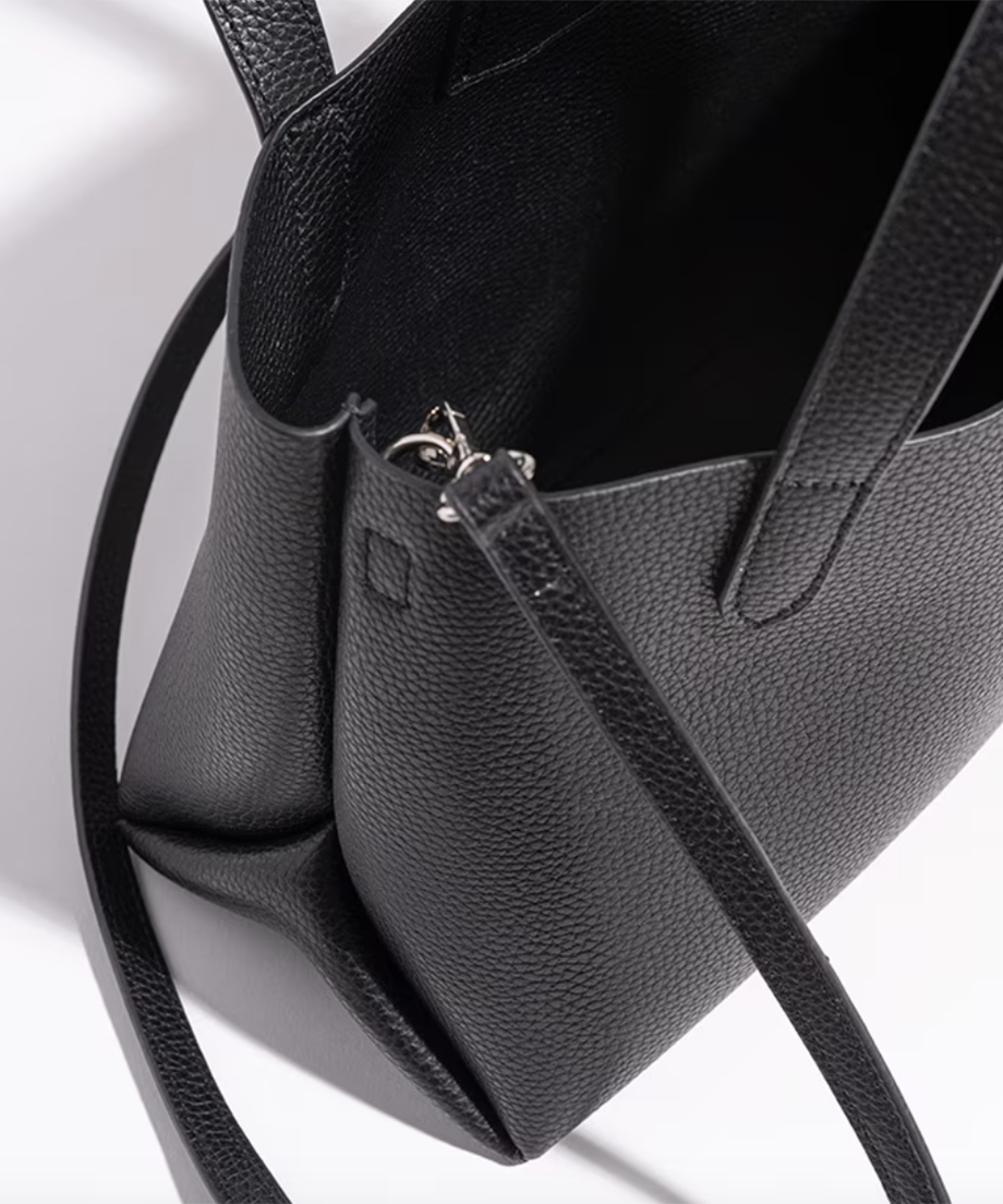 W FACEレザーを使用した2WAYトートバッグ。やわらかな手触りと自然なシボ感が魅力の床革を用い、シンプルながら上品な表情に仕上げました。小ぶりなサイズ感ながら、デイリーに必要な荷物がしっかり収まる実用的なデザインです。ハンドルは“ハの字”に取り付けることで、腕周りに自然と沿い、持ちやすく快適なフィット感を実現。取り外し可能なショルダーストラップは金具を内側に配し、ハンドバッグとして使う際もすっきりとした佇まいを保ちます。マグネット開閉で出し入れもスムーズ。