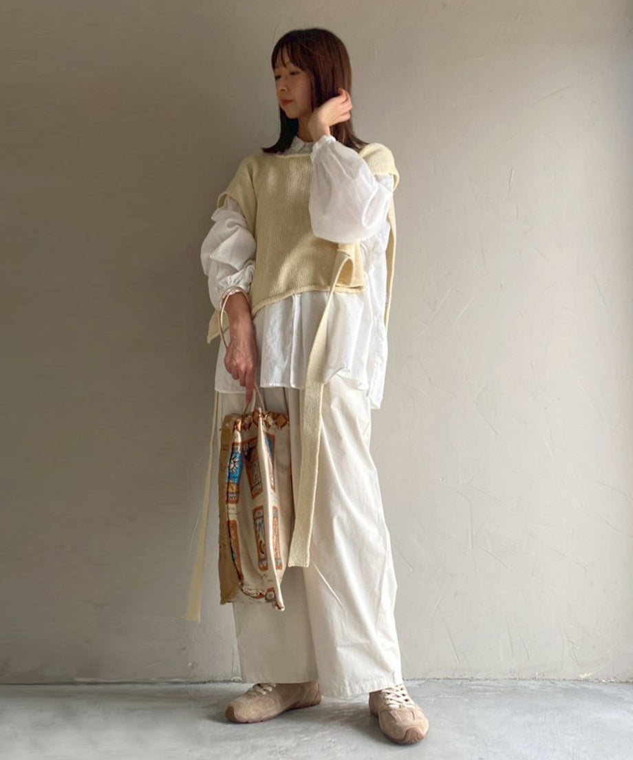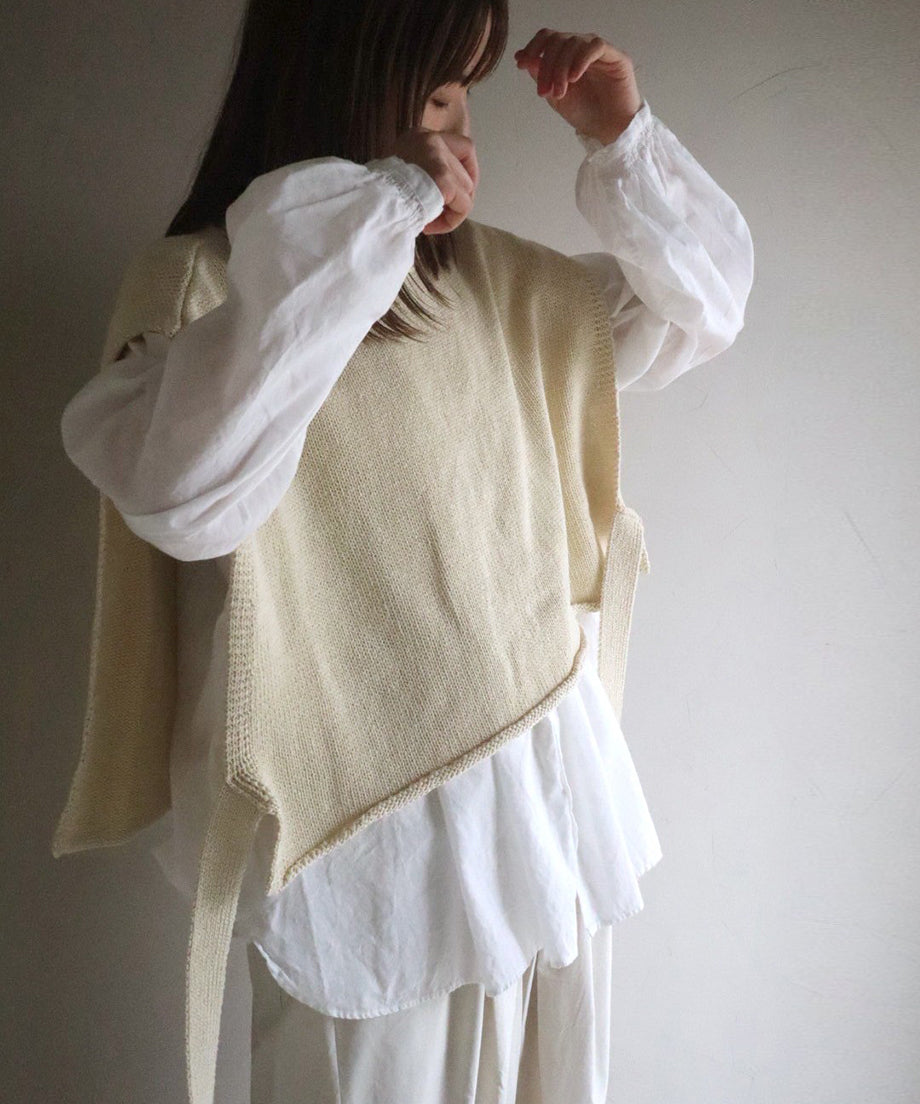 コットン100%の糸にシルケット加工を施し、毛羽立ちを抑えて上品な光沢を表現したニットベスト。ナチュラルなクラフト感と洗練された雰囲気を兼ね備えています。前後どちらでも着用できる2WAY仕様。サイドの紐でシルエットを調整し、気分に合わせた着こなしを楽しめます。