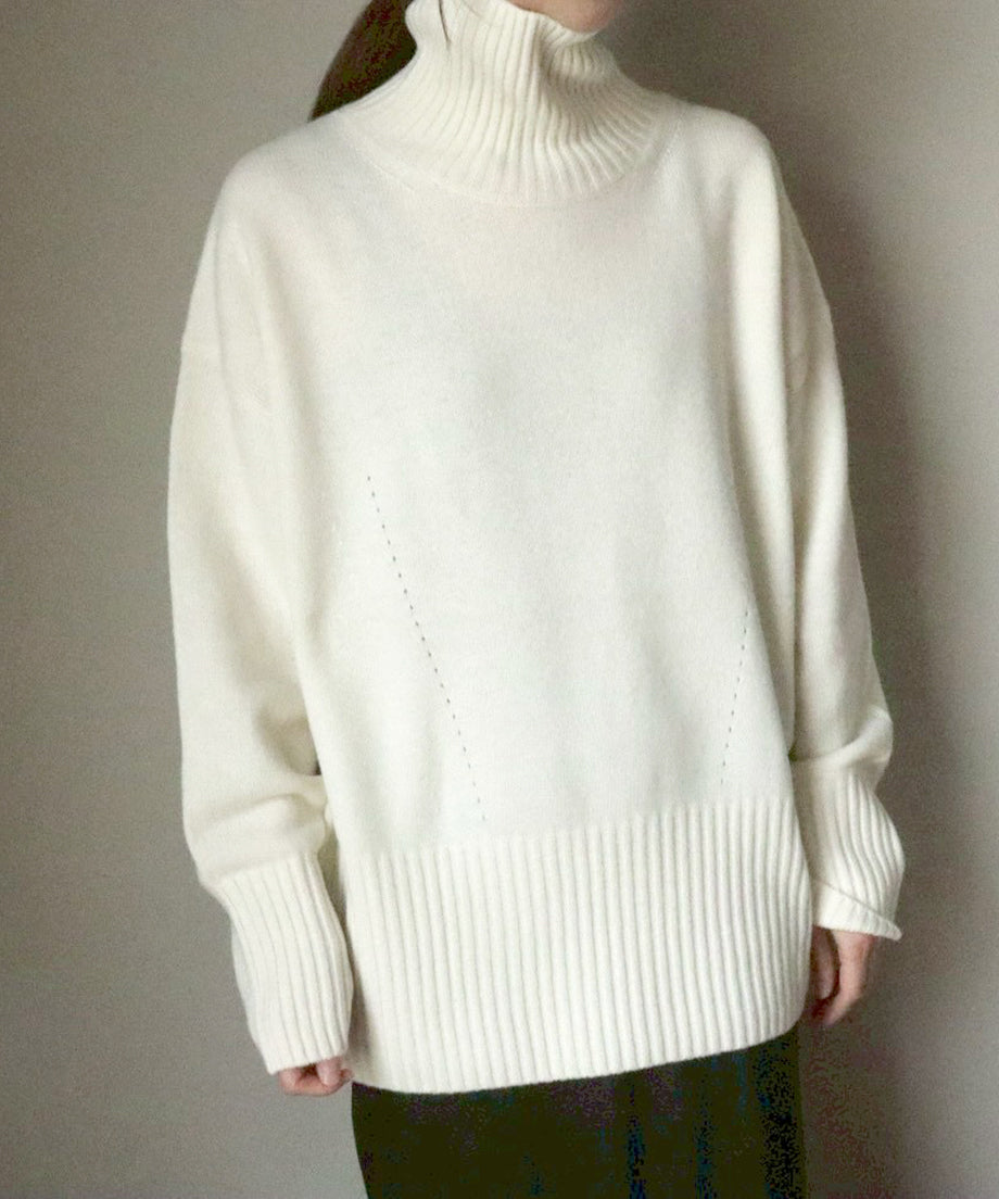 ウルトラファインメリノにカシミヤをブレンドした、贅沢な肌触りのハイネックプルオーバー。長めのハイネックはクシュっとラフに着こなせ、抜け感のあるスタイルが楽しめます。袖口と裾の長めリブが全体をすっきり見せ、リラックス感と上品さを両立した一枚。