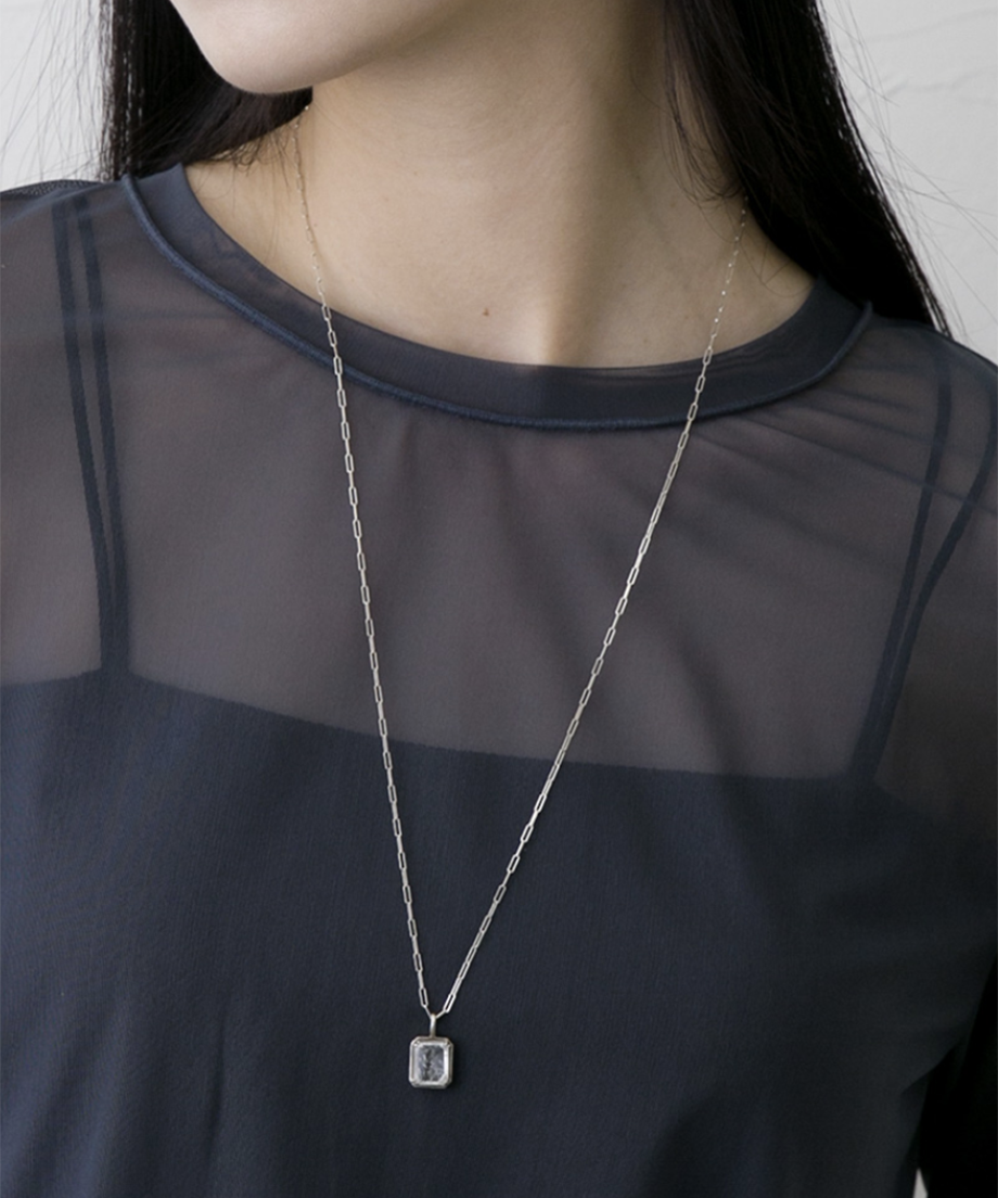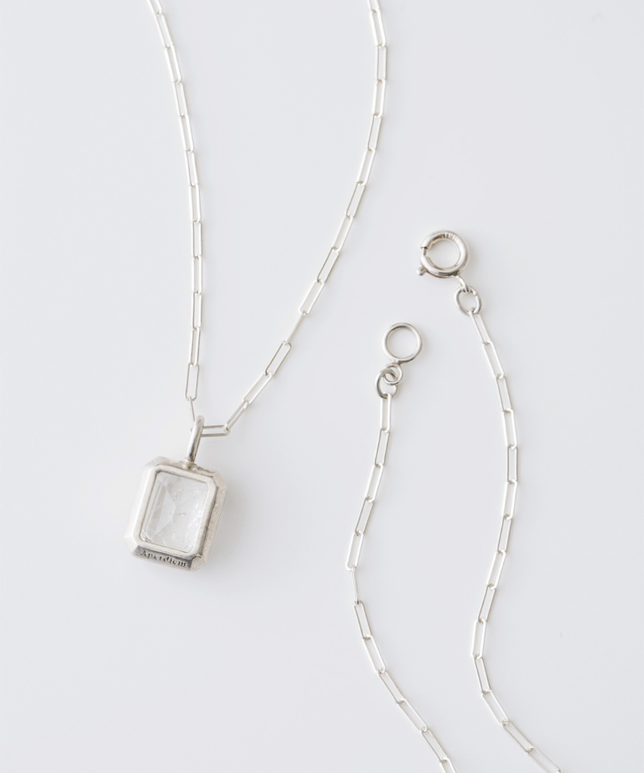 昔見つけた、少し不完全だけれど心惹かれる美しい石——そんな記憶を閉じ込めたようなシリーズ。オリジナルのダブレットストーンにはあえてクラック加工を施し、ひとつとして同じものがない奥行きと陰影を表現しました。クリアな輝きとは異なる、静かな深みと個性が魅力です。クラシカルなスクエアルースを主役に、繊細なスクエアチェーンを合わせたロングネックレス。やや大ぶりのトップが装いに上品な存在感を添え、秋冬のスタイルにさりげない華やかさをプラスします。