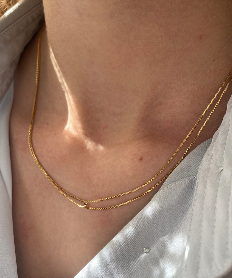 2本のネックレスから成る、美しく象徴的なネックレス。2つが洗練された方法でひとつに繋がり、上品でとてもエレガントな佇まいに仕上がっています。