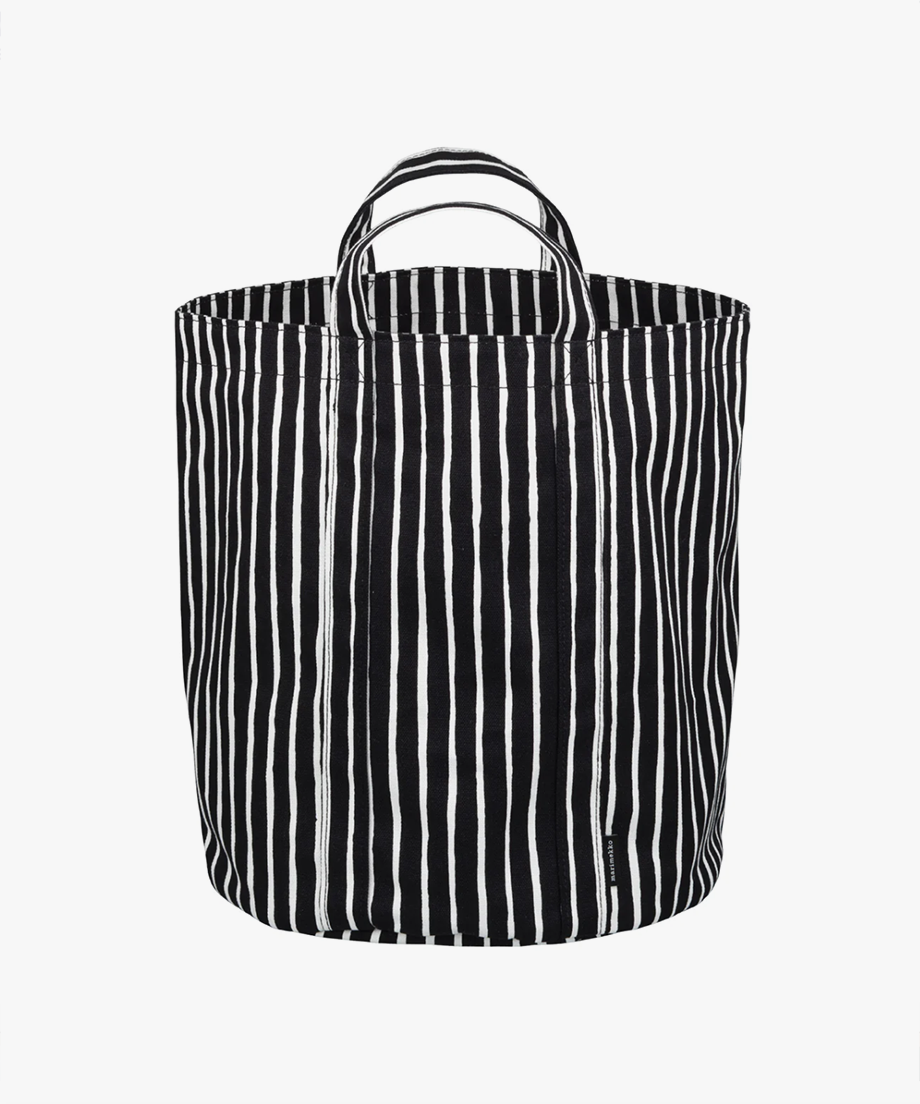 マリメッコのデザイナーによる自由奔放な筆タッチのストライプ柄「Piccolo(ピッコロ)」をあしらった収納バスケット。収納用品でありながら、まるでアート作品のような存在感を放ちます。両サイドに持ち手が付いているので、大きめのトートバッグとしても使えます。しっかりとした生地で自立するタイプのため、型崩れしにくく、手に持ってもスマートな印象。
