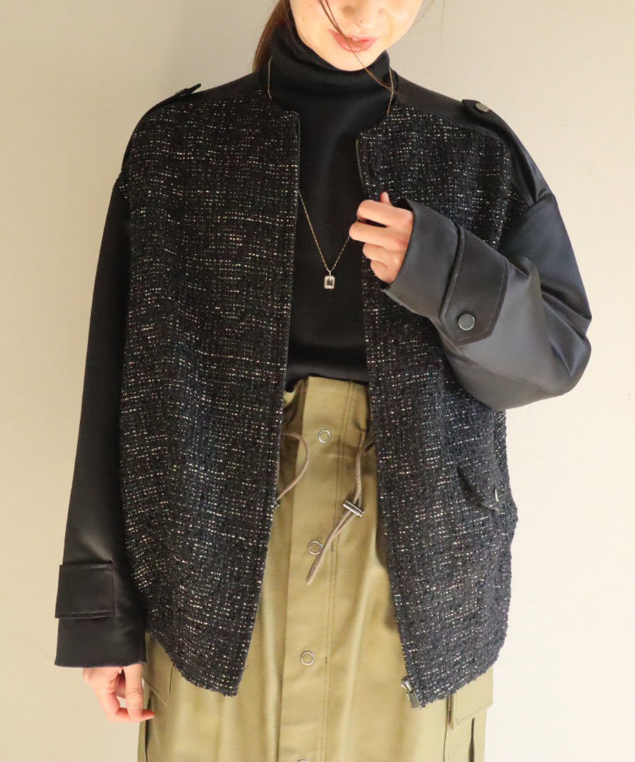 サテン生地をコンビ使いした、表情豊かなブルゾン。裾にタックを施すことで、自然な丸みを持たせた上品で女性らしいシルエットに仕上げています。控えめにきらめくラメと、色とりどりのブークレー糸が複雑に重なり合った素材感が特徴で、動くたびに奥行きのある表情を演出。シンプルなスタイリングに合わせるだけで、コーディネート全体を華やかに格上げします。