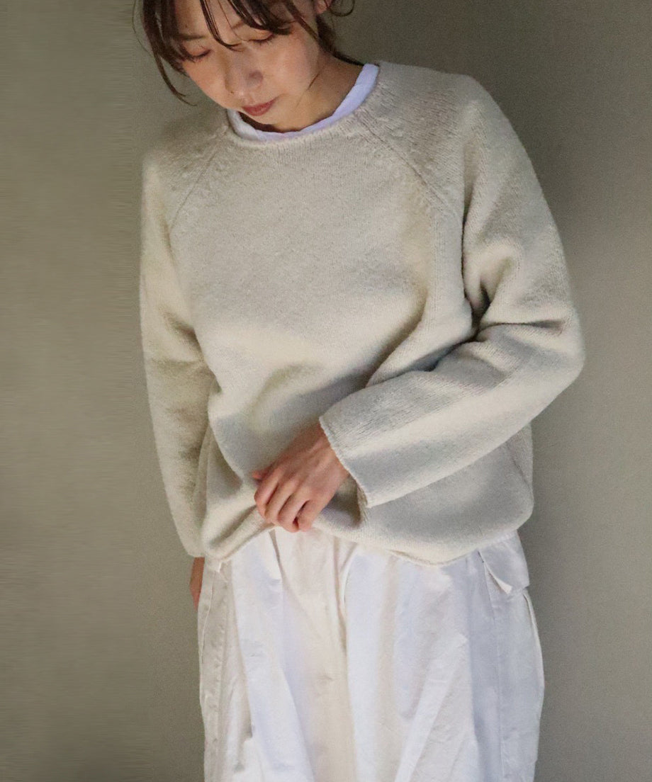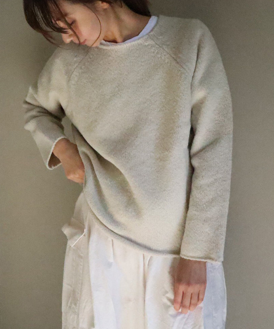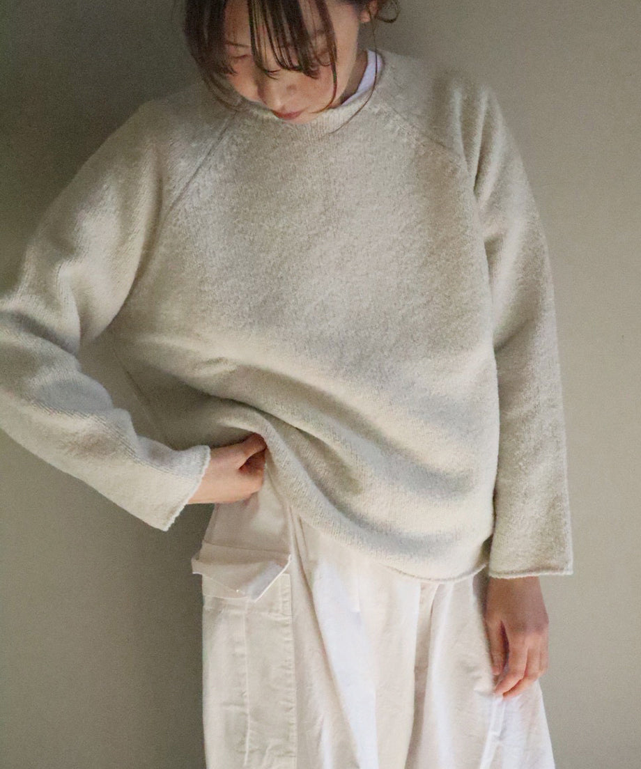 定番のプレスウールシリーズから生まれた、サステナブルな新素材“renew-wool”。製造過程で残った端材を粉砕し、再び糸として再生しました。今季は、ウールの繊細なループ糸を組み合わせることで、程よい密度と軽やかさ、そして柔らかな暖かみを兼ね備えた風合いに。空気をたっぷり含むゆったりとしたシルエットで、リラックス感のある着心地が特徴です。