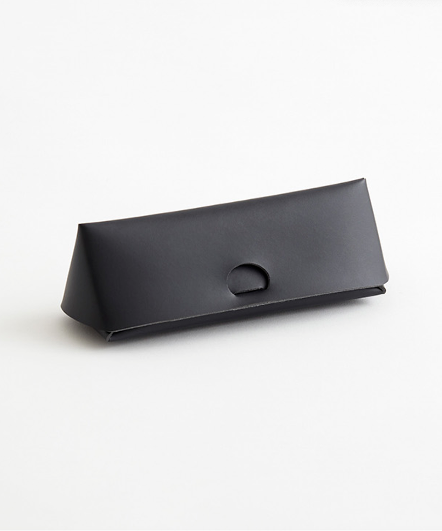 縫製がなく、折り紙を折るように折り込んで形成され立体的な三角形フォルムが特徴のメガネ&ペンケース。