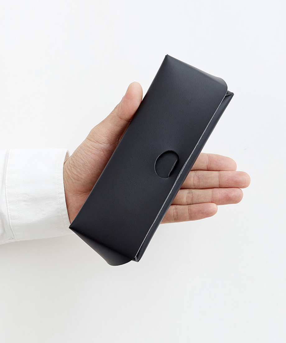 切り込みに差し込んでいる部分で開閉、メガネを入れてもゆとりのあるサイズ感。三角型で収まりもよく、開けた状態でも自立し、取り出しやすく使い勝手も抜群。
